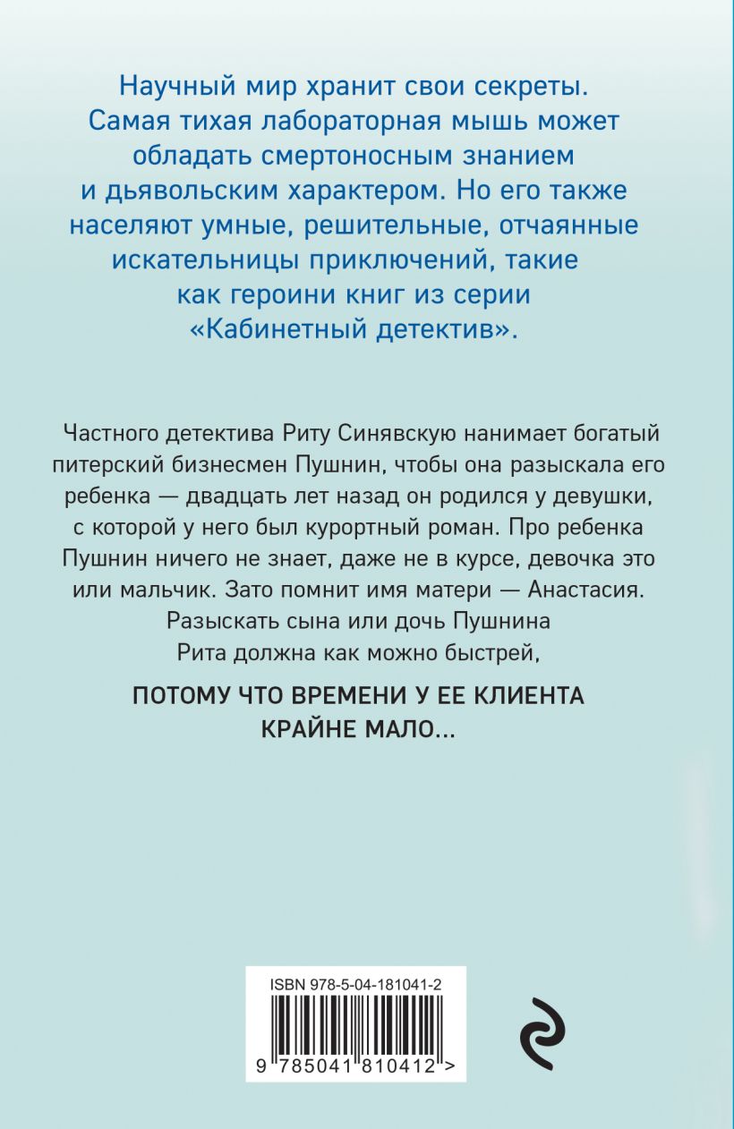 Частного детектива Риту Синявскую нанимает богатый питерский бизнесмен Пушнин, чтобы она разыскала его ребенка – двадцать лет назад он родился у девушки, с которой у него был курортный роман. Про ребенка Пушнин ничего не знает, даже не в курсе, девочка это или мальчик. Зато помнит имя матери – Анастасия. Разыскать сына или дочь Пушнина Рита должна как можно быстрей, потому что времени у ее клиента крайне мало…
