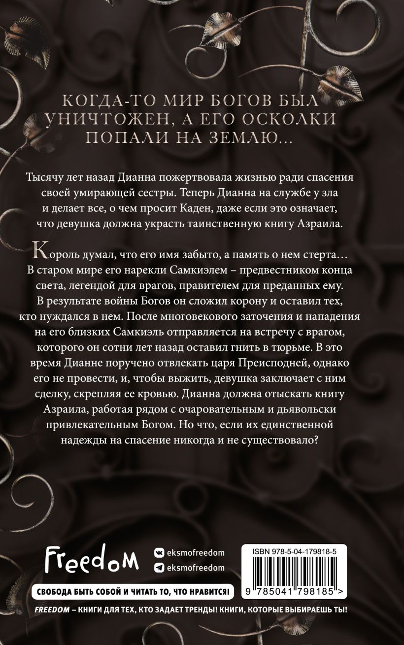 В старом мире его нарекли Самкиэлем. В новом его имя Лиам, но одно осталось неизменным – он предвестник конца света, легенда для врагов, правитель для преданных ему. После войны Богов он скрылся от мира, сложил корону и оставил тех, кто нуждался в нем больше всего, выживать на умирающей земле. После многовекового заточения и нападения на его близких, Самакиэль отправляется на встречу с врагом, которого он сотни лет назад оставил гнить в тюрьме. В это время Дианне поручено отвлекать царя Преисподней, однако, его не провести, и, чтобы выжить, девушка заключает с ним сделку, скрепляя ее кровью. Дианна должна отыскать книгу Азраила, работая рядом с очаровательным и дьявольски привлекательным Богом. Но что если их единственной надежды на спасение никогда и не существовало?